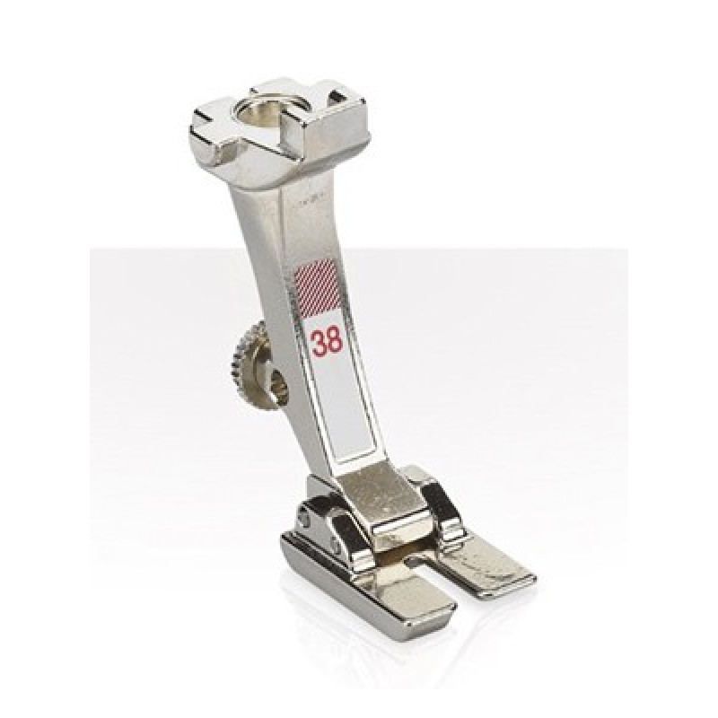 Правая сторона лапки приподнята, что позволяет легко проходить по нескольким слоям материала. Кроме того, лапка №38 отлично справляется с пришиванием толстых тесьм, шнуров или липучек. Если тесьма располагается под более высокой стороной вплотную к канту толстой левой части лапки, игла может максимально точно захватывать кант тесьмы, обеспечивая аккуратный результат.