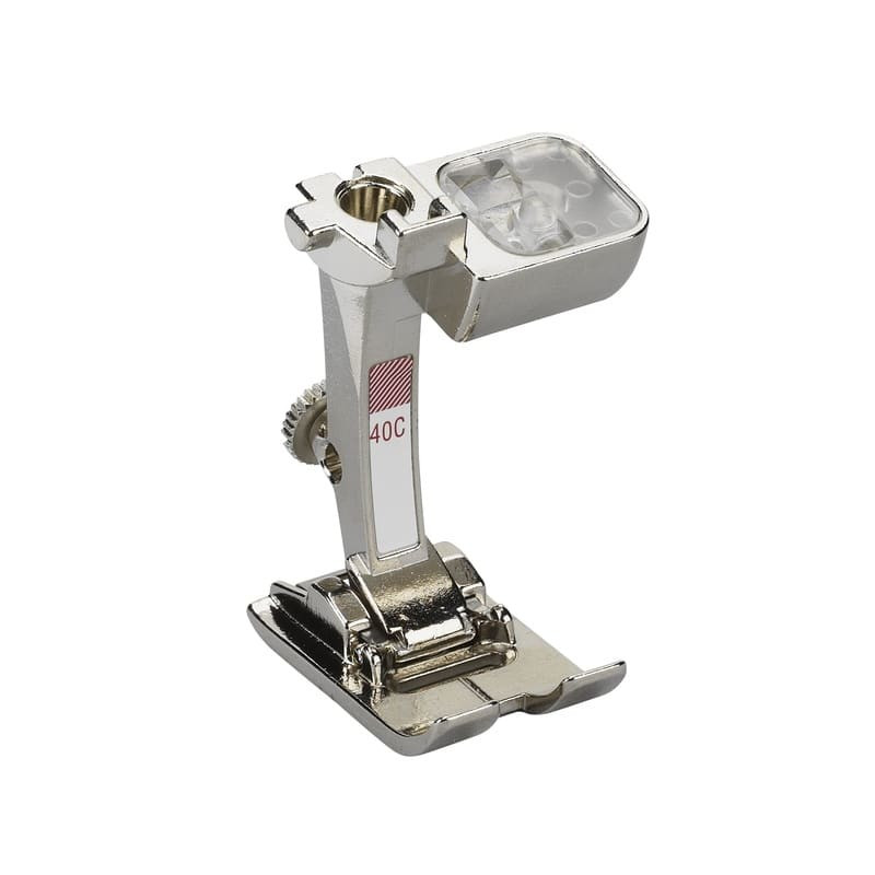 Главное преимущество этой лапки – скошенный край отверстия для нитки, благодаря которому строчки свободно скользят под лапкой во всех направлениях. Кроме того, в конструкции отсутствуют лишние отверстия, где могла бы застрять нить, что делает процесс шитья более плавным и надёжным. Работы получаются аккуратными, а выполнение даже больших проектов занимает меньше времени.