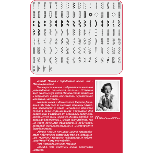 Швейная машина VERITAS Marion с городостью носит имя - Мэрион Донован! Она выросла в семье изобретателя и сполна унаследовала отцовский талант. Особенно ярко он вспыхнул, когда Мэрион стала матерью и задумалась о том, как сделать переодевание младенца «чистым». Усталая мама и домохозяйка Марион Донован в 1917 году села за швейную машину и после нескольких попыток создала водонепроницаемые покрытия для подгузника. В отличие от резиновых ползунков, которые уже были на рынке, дизайн Донован не вызывал опрелостей и не жал кожу ребенка. Так на свет появился одноразовый подгузник, который изобретательница многократно дорабатывала.